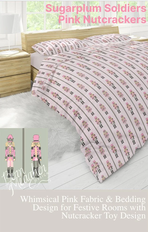 Sugarplum Soldiers Nutcrackers Christmas Collection is now available in pink as well as traditional colorways. This design brings a joyful charm available in different styles—reds and green tones for a more traditional statement, or pink whimsical shades for a modern alternate look. Whether used as home décor, fabric, or wallpaper, this Sugarplum Soldiers Nutcracker design transforms any space with its whimsical edge and versatile charm.. These relaxed, elegant patterns are ideal for home decorators, DIY sewists and makers, interior stylists, and brands looking to license seamless patterns for custom textiles, gift wrap, bedding, table linens, or stationery.